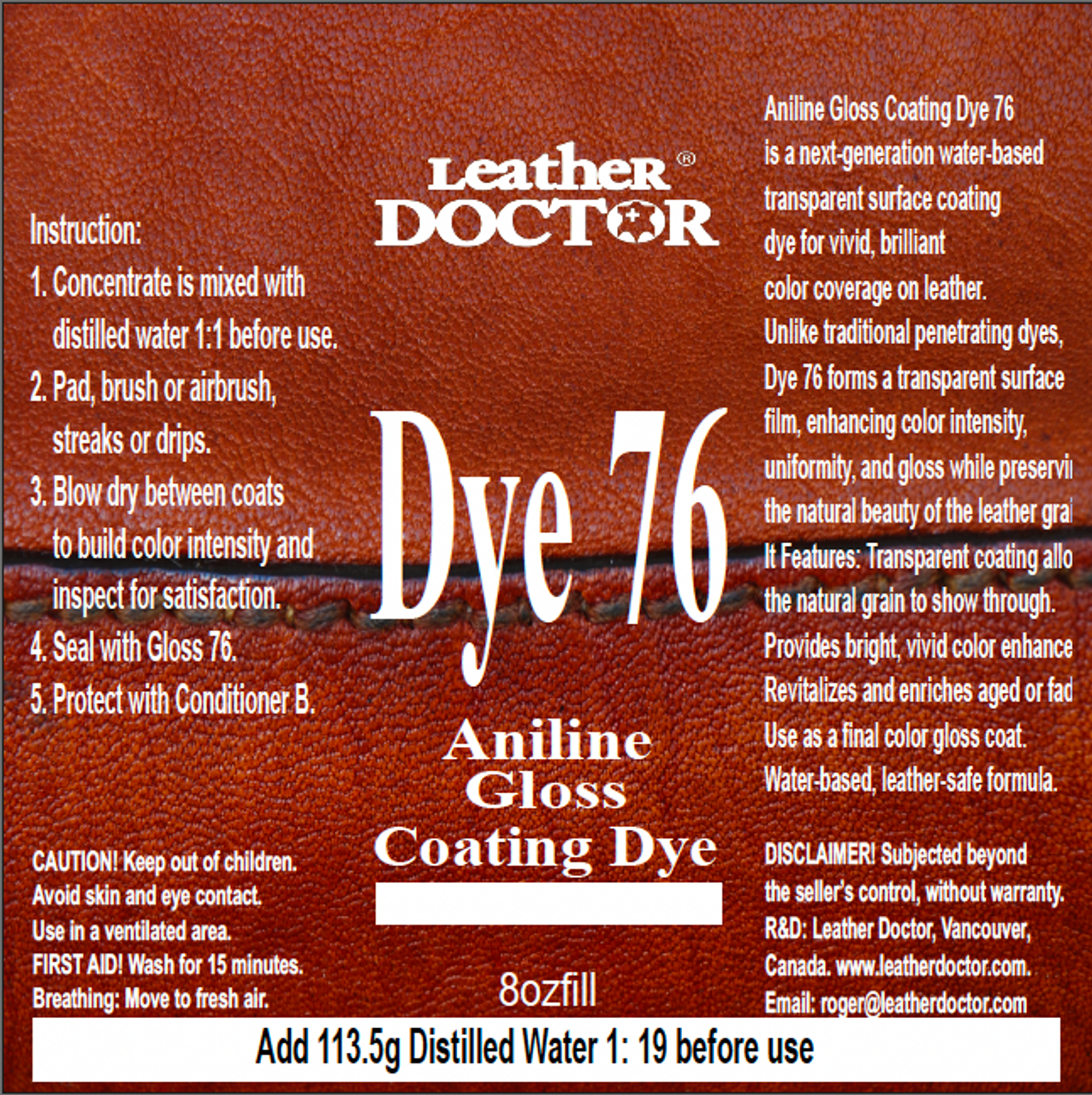 Aniline Gloss Coating Dye 76 by Leather Doctor® is a next-generation water-based transparent surface coating dye formulated for vivid, brilliant color coverage on leather.