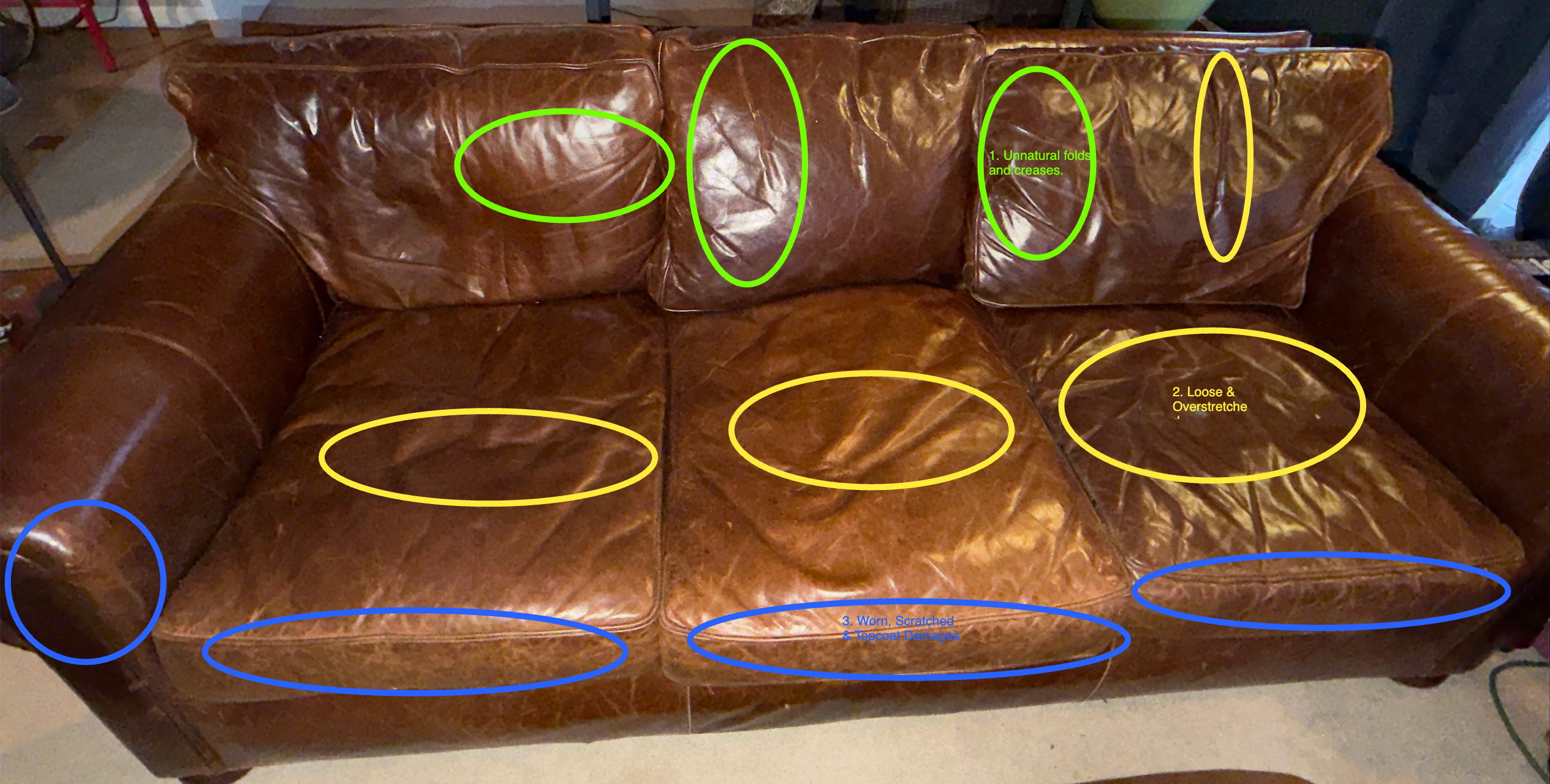 Loose seating and sharp creases occur when leather loses its internal fat and oil over time. This causes fiber fatigue, overstretching, and unnatural folds—not just surface wear.