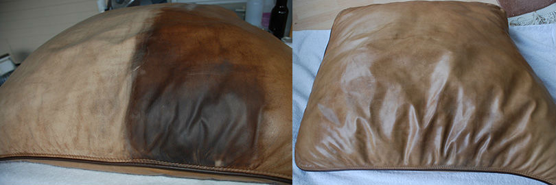 (Before & after images shown above: Aniline leather cushion damaged by prolonged body contact, and the same cushion after Leather Doctor® system restoration.)
