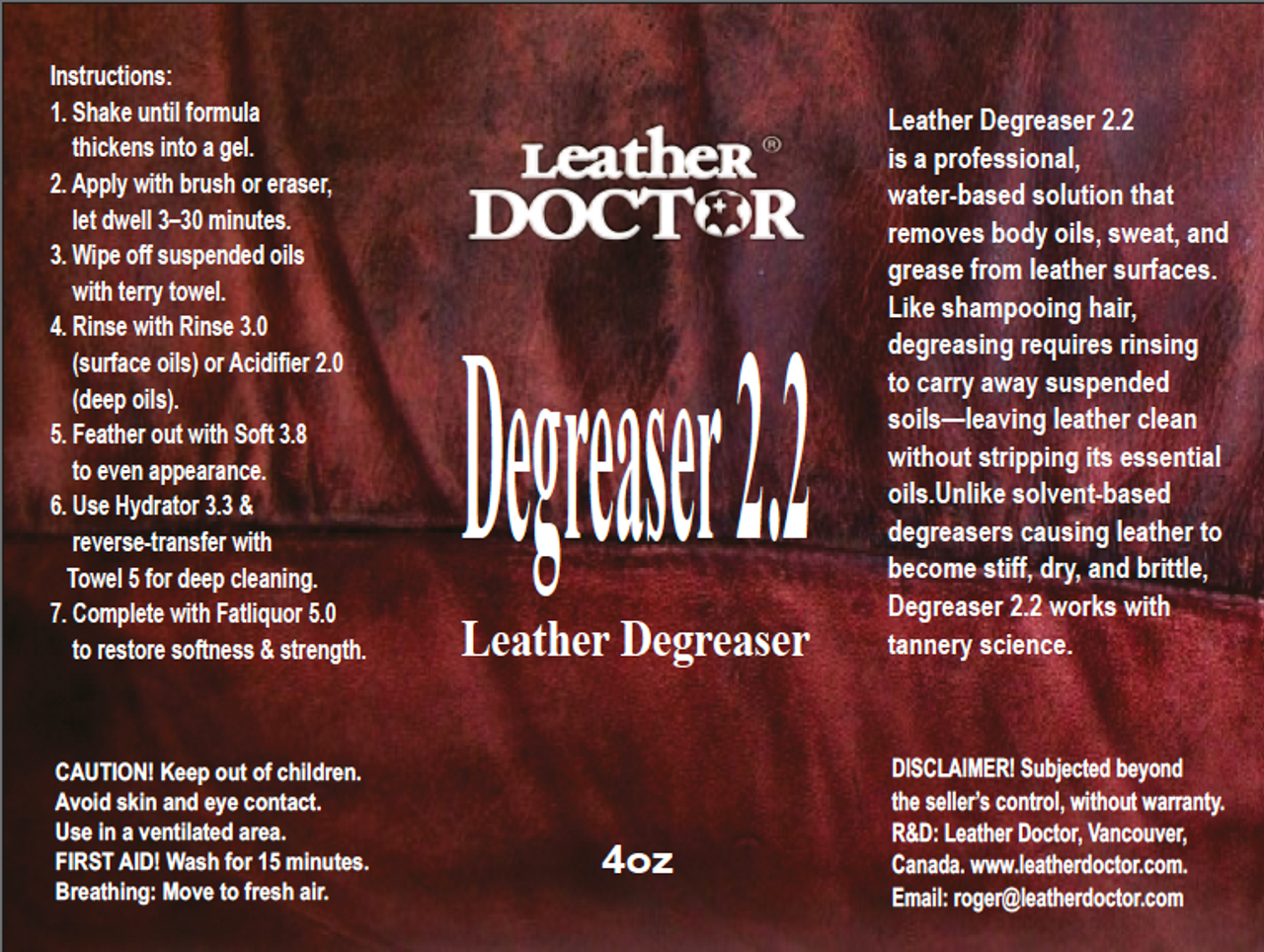 - Unlike solvent-based degreasers that dissolve essential fatliquor and leave leather stiff and dry, Leather Doctor® Degreaser 2.2 uses a low pH 2.2 water-based formula that preserves leather chemistry—maintaining the ionic attraction between fibers, tanning agents, dyes, and oils.