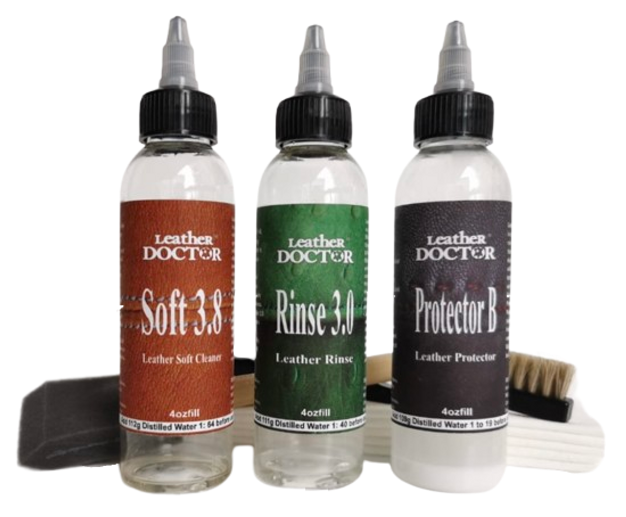 Kit T2 concentrates contents require 332g (0.35quart) 4ozfill and 664g (0.7 quarts) 8ozfill of distilled water to be mixed and filled before use with these selected leather-safe products: