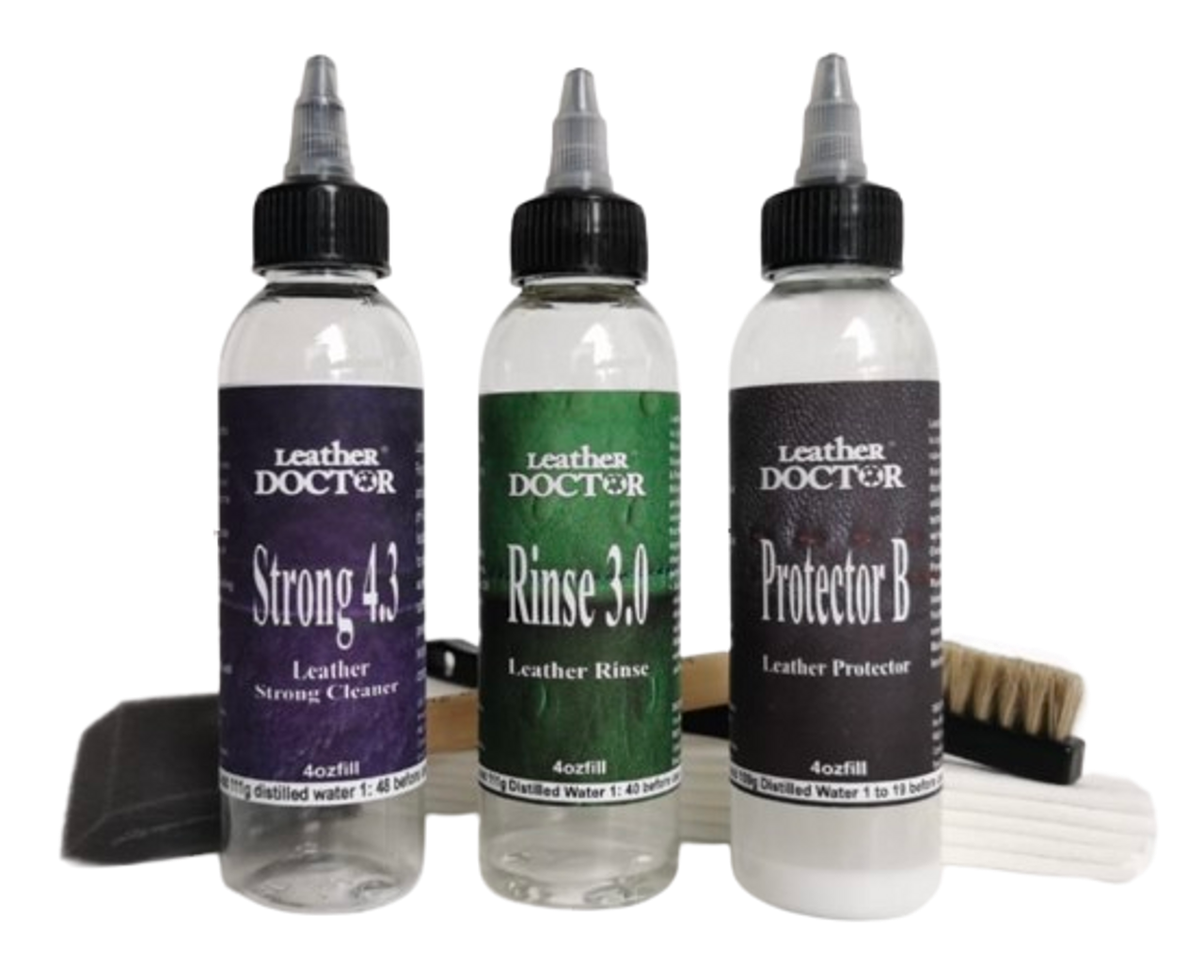 Kit G2 concentrates contents require 332g (0.35quart) 4ozfill and 664g (0.7 quarts) 8ozfill of distilled water to be mixed and filled before use with these selected leather-safe products: