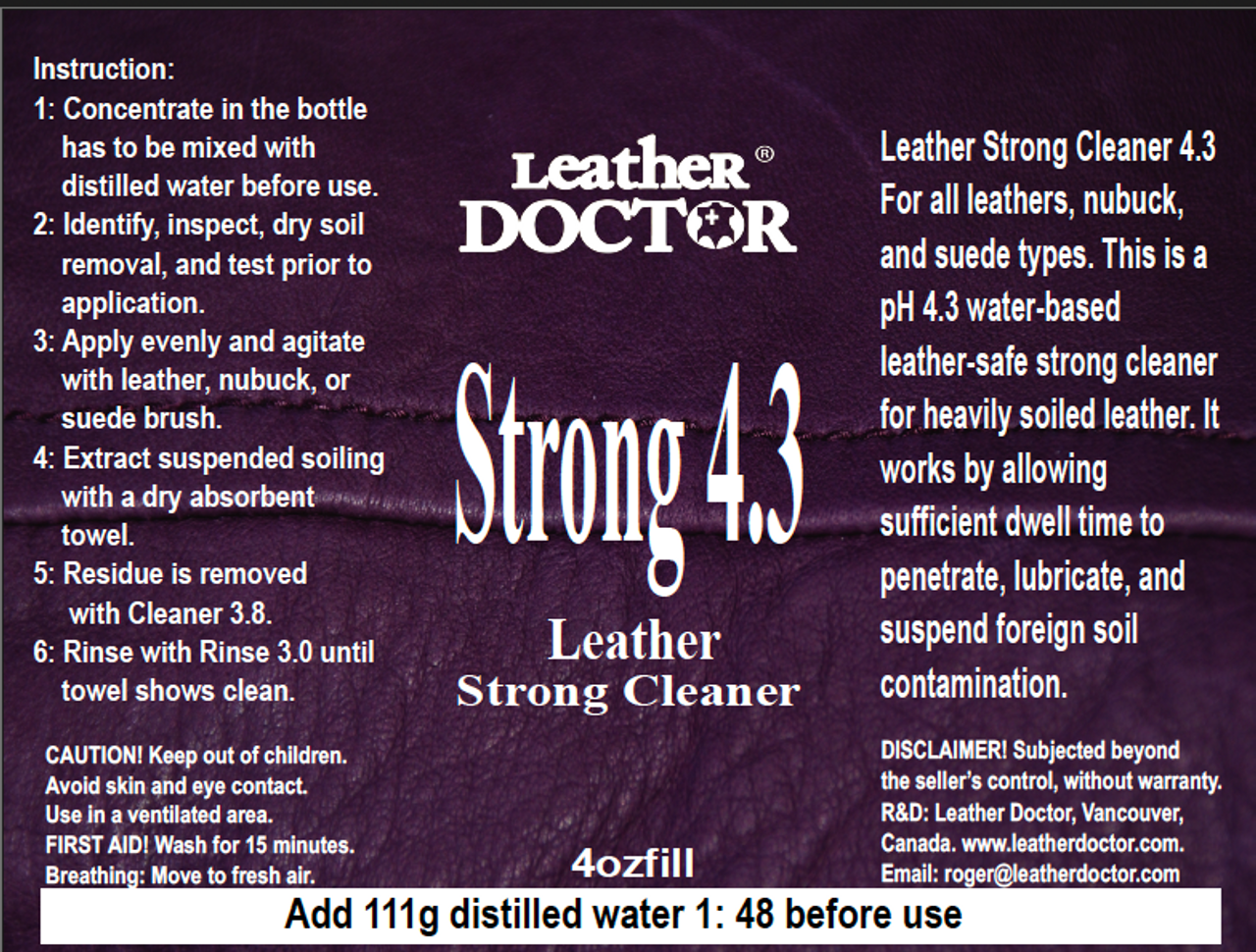 Leather Strong Cleaner 4.3 (Strong 4.3) by Leather Doctor® is a pH 4.3, water-based strong leather cleaner, specially formulated for periodic deep cleaning of heavily soiled leather, especially in high-use areas.