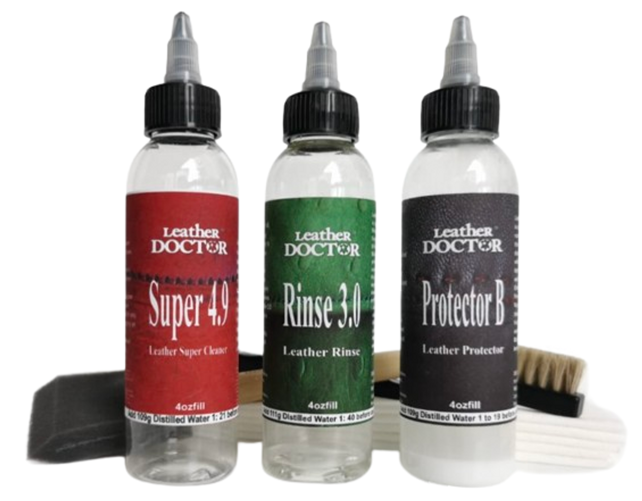 Kit R2 concentrates contents require 328g (0.36quart) 4ozfill and 656g (0.7 quarts) 8ozfill of distilled water to be mixed and filled before use with these selected leather-safe products: