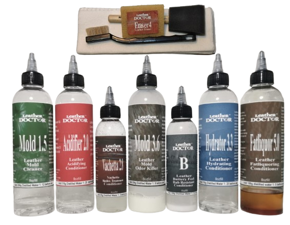 Vachetta Leather Mold Killer Kit V5.mk by Leather Doctor® is a Leather-Safe™ fungicide mold killer, sanitizer, and deodorizer specifically designed for Vachetta and all vegetable-tanned leathers.