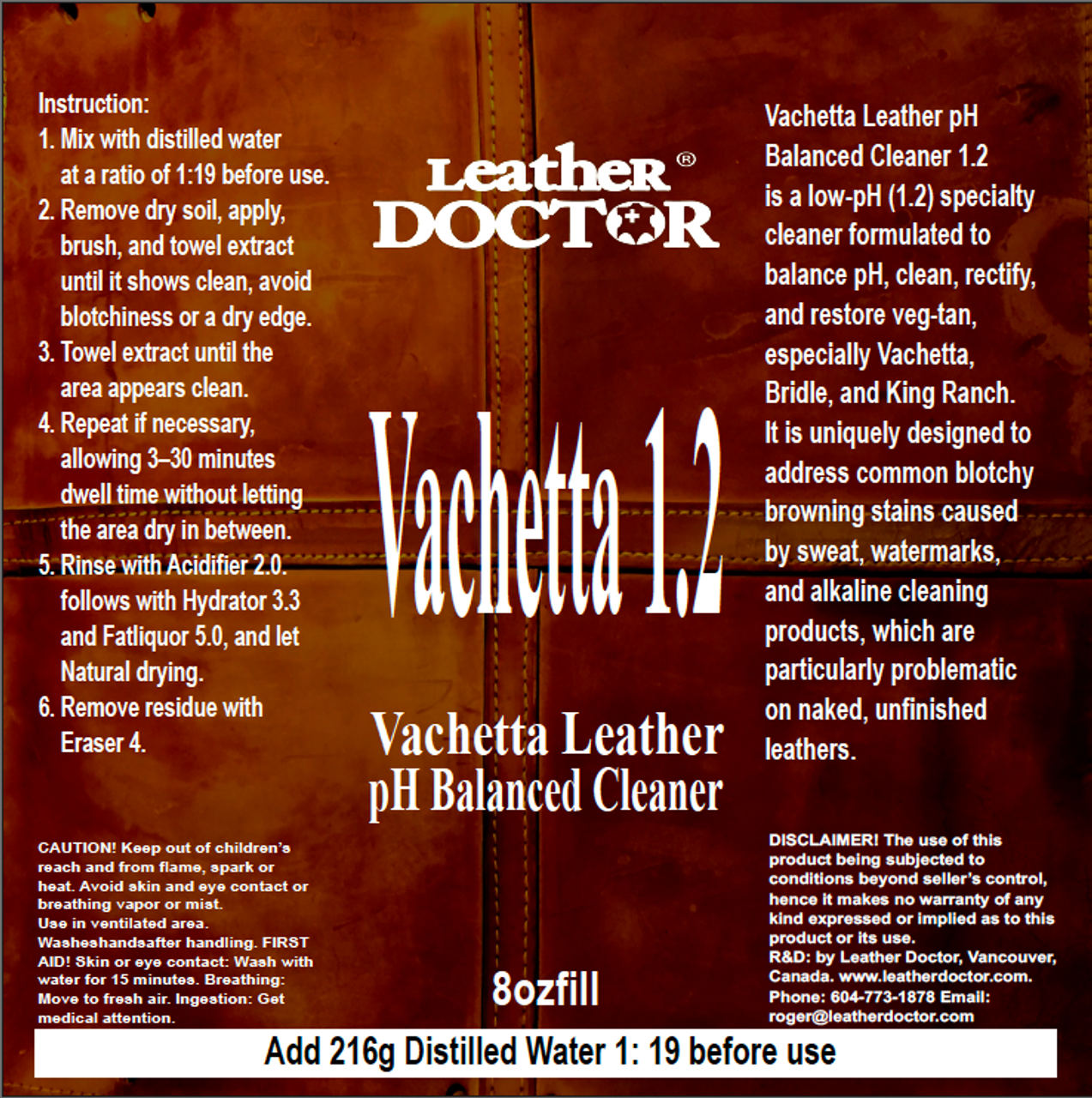 Vachetta 1.2 is a low-pH (1.2) specialty cleaner formulated to balance pH, clean, rectify, and restore vegetable-tanned leathers—especially Vachetta, Bridle, and King Ranch. It is uniquely designed to address common blotchy browning stains caused by sweat, watermarks, and alkaline cleaning products, which are particularly problematic on naked, unfinished leathers.